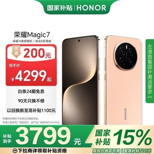 荣耀HONORMagic712GB+256GB5G手机,现已在京东开启超值促销活动!原价4499元的朝霞金版本,通过满减优惠与部分省份国补政策叠加,到手价仅需3749元,是近期难得的好价!荣耀Magic7搭载最新骁龙8至尊版处理器,配备LPDDR5X内存和UFS4.0闪存,性能强劲且高效节能。屏幕采用6.78英寸OLED超窄等边直屏设计,支持1-120HzLTPO动态刷新率,峰值亮度高达5000nit,并通过德国莱茵T?V全局护眼4.0认证,带来极致视觉体验的同时呵护您的双眼。影像系统方面,后置三摄包括50MP主摄、50MP超广角和50MP长焦镜头,支持3倍光学变焦和50倍数码变焦,前置50MP自拍镜头,满足全场景拍摄需求。此外,5650mAh大电池配合100W有线快充和80W无线充电,让续航更持久。更有天通卫星通信、北斗卫星短信、IP68/IP69级防尘防水等多项黑科技加持,性能与实用性兼备。荣耀Magic7,艺术美感与现代科技的完美融合,值得您拥有!
